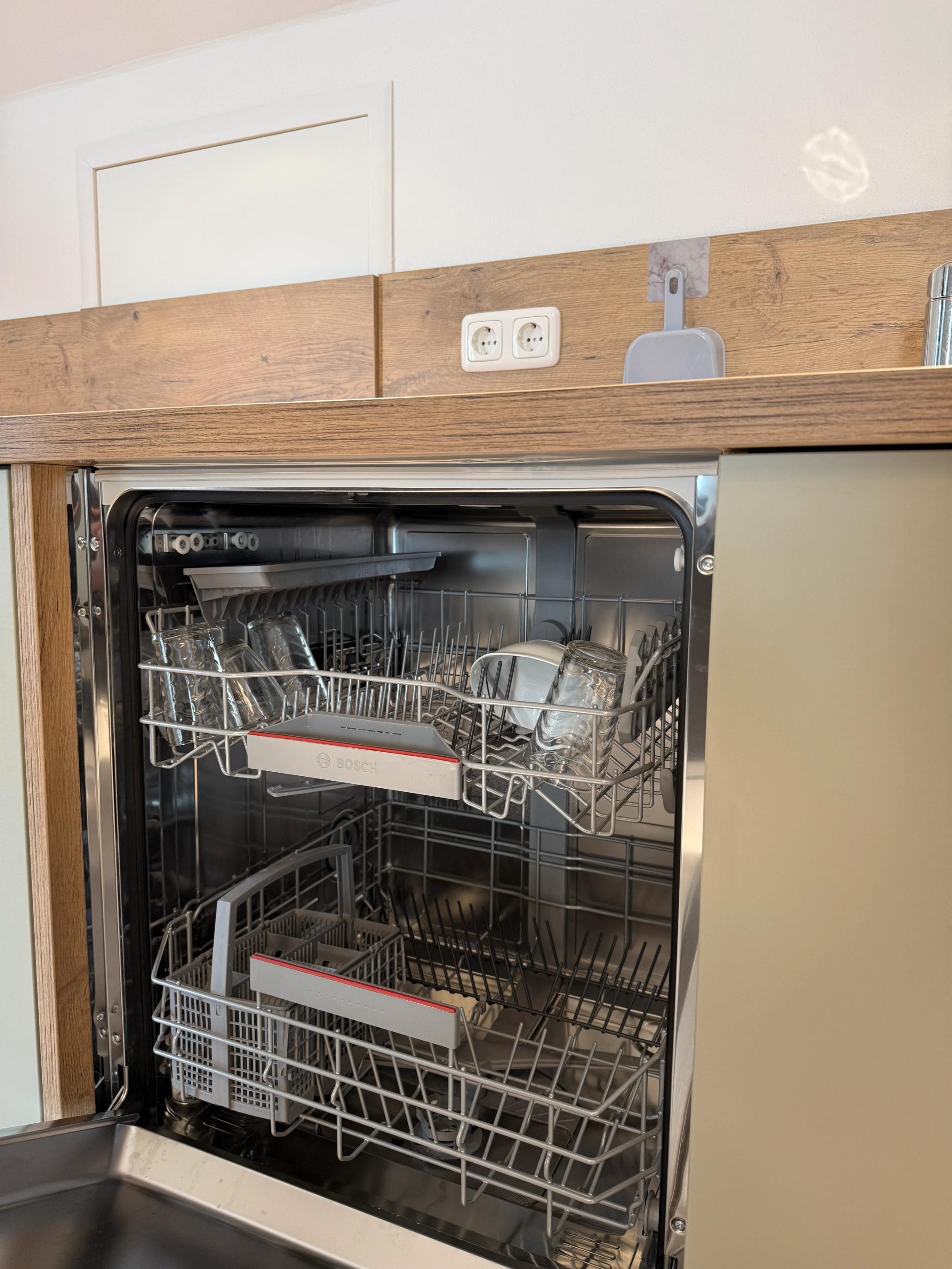 Voll ausgestattete Küche mit Kaffeemaschine - ideal für Monteure und Familien.